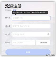 ③、在注册页面,我们按照系统要求输入用户名、手机号、密码后,点击“获取验证码”,系统会自动发短信到我们输入的手机号中。我们将收到的验证码输入进入,并勾选“阅读并接受相关协议和隐私保护声明。最后点击注册,系统就完成注册了。