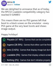 目前,除了通过索尼官方PSN会员服务之外,PC用户还可以通过PS3模拟器来进行游戏。而且PS3模拟器的开发一直没有停过。近日,知名PS3模拟器RPCS3已经完成了对所有PS3游戏的支持,这意味着RPCS3实现了PS3游戏的100%运行。该团队通过推特也宣布了这一消息。